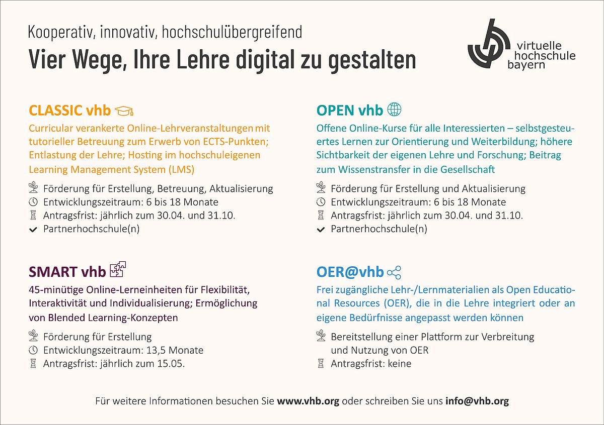 Nutzen Sie als Lehrende die Fördermöglichkeiten der Virtuellen Hochschule Bayern (vhb), um hochwertige digitale Lehr- und Lernmaterialien zu erstellen und diese mit Studierenden aus ganz Bayern zu teilen. Unterstützt werden CLASSIC vhb-Kurse, SMART vhb-Lerneinheiten und frei zugängliche OPEN vhb-Kurse – von der Entwicklung bis zur tutorierten Durchführung. Mehr Informationen finden Sie unter https://www.vhb.org/lehrende/