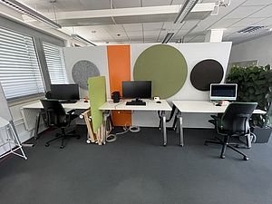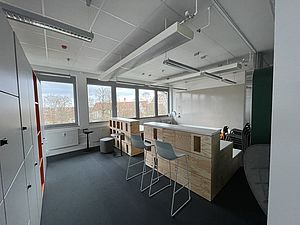 Studierende können außerdem Schließfachschränke mit Stromanschluss nutzen, um private Sachen an einem Ort zu lagern oder elektrische Geräte abgesichert aufzuladen. Die schallisolierte Phonebox lädt zum fokussierten Arbeiten alleine oder zu zweit in einer ruhigen Umgebung ein.