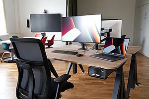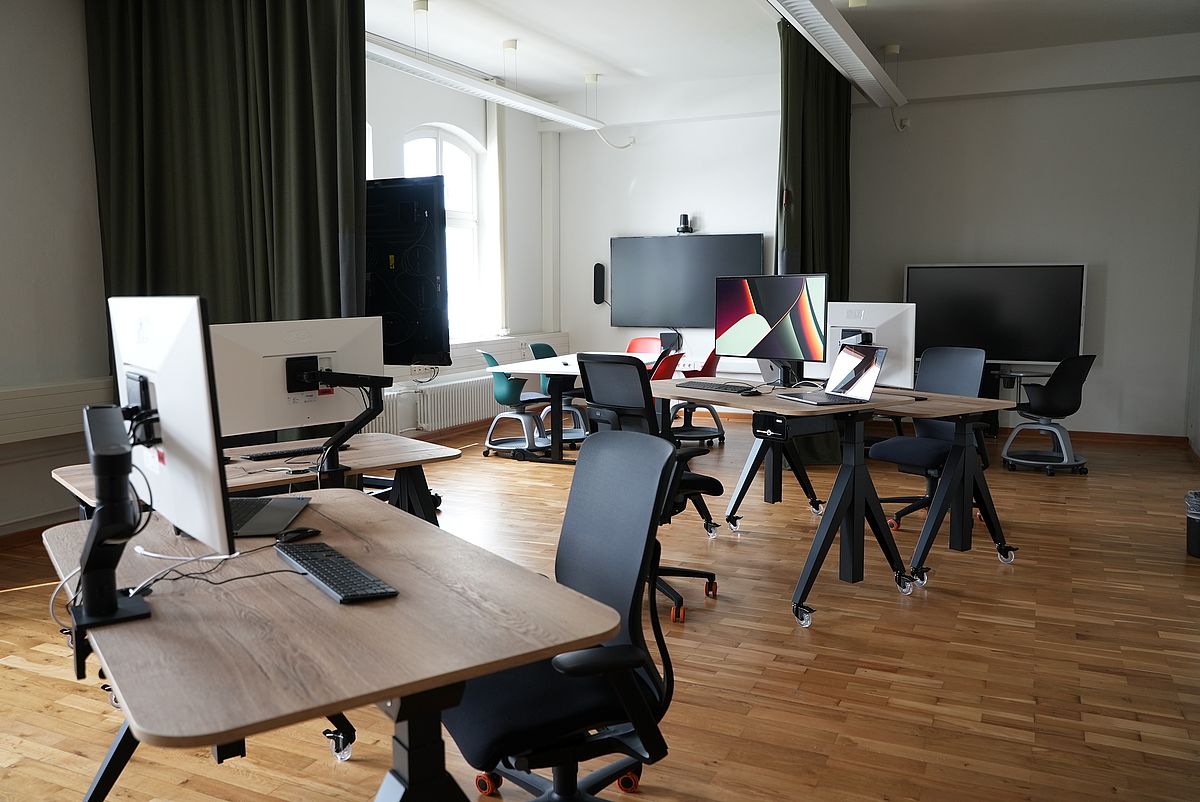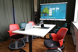Der Raum ist mit mobilen Stühlen und integriertem Schreibtablar ausgestattet. Lerninseln mit Gruppenbildschirmen, ein Smart-Board und eine große Videowall können für Präsentationen oder zum Teilen des eigenen Bildschirms genutzt werden. Ergänzt wird die Ausstattung durch ein Videokonferenzsystem für die Durchführung von hybriden oder komplett digitalen Veranstaltungen.
