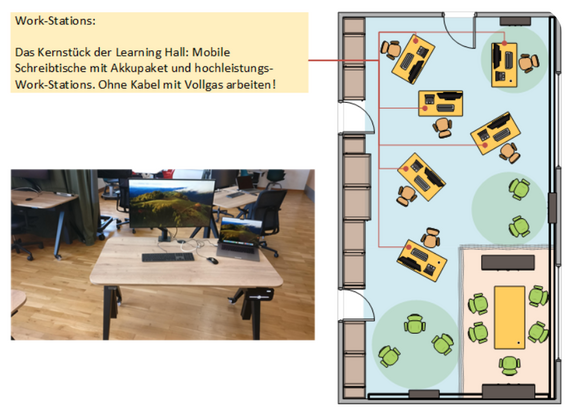 Die Learning Hall wurde als innovativer Raum für das individuelle Lernen und Arbeiten mit digitalen Medien konzipiert. Kernstück des Konzepts bilden die von der kabelgebundenen Strom- und LAN-Versorgung autarken Hochleistungs-Work-Stations. Zum Einsatz kommen hierfür leistungsstarke MacBook Pro die durch einen externen Bildschirm, Tastatur und Maus ergänzt werden. Diese sind jeweils in einen modernen, mobilen, höhenverstellbaren, akkubetriebenen Arbeitsplatz integriert. Die Akkukapazität ist dabei auf einen arbeitsintensiven Arbeitstag ausgelegt. Sollte sie aber doch nicht reichen, tauscht Ihr einfach den Akku und weiter geht’s. Natürlich könnt ihr auch eure mitgebrachten eigenen Geräte verwenden und diese alternativ zum MacBook am akkubetriebenen Arbeitsplatz einsetzen. Oder Ihr nutzt einen der Einzelarbeitsplätze oder die Seminarstühle. Wenn euch die Bildschirme zu klein sind, oder für Gruppenarbeiten ein wirklich großer Bildschirm gebraucht wird, könnt ihr die Bildschirme an den Wänden nutzen. Wie im digitalen Klassenzimmer einfach per Cynaps damit verbinden. Ein Teil des Raumes kann per Schallschutzvorhang vom restlichen Raum abgetrennt werden. Dieser "virtuelle Collaboration Space” ist für Besprechungen und Gruppenarbeiten vorgesehen.